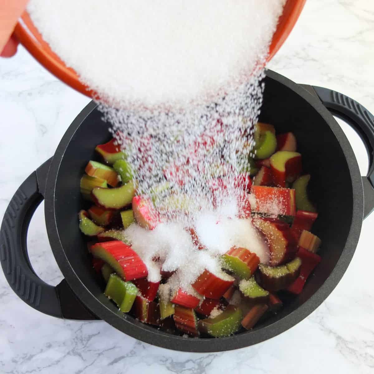 - Place the rhubarb chunks in a large saucepan and sprinkle with the sugar. Let the mixture sit for about 30 minutes, stirring occasionally. The rhubarb will begin to release its juices naturally-do not add extra water, as this would dilute the flavor.100 g granulated sugar