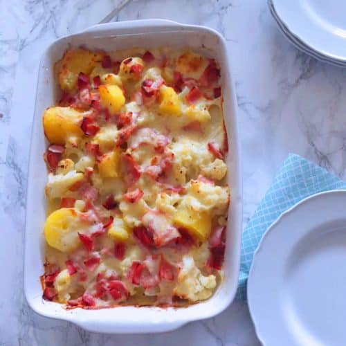 This easy vegetable gratin is literally a life-saver when I want to make something quick, healthy, and vegetarian for my family on busy weeknights. This cheesy, creamy vegetable oven bake makes my kids completely forget there's no meat in it. (Honestly, they never even ask!) The combination of their favorite vegetables (potatoes, carrots, cauliflower, and peas) in a perfectly seasoned creamy sauce disappears from the table in minutes.